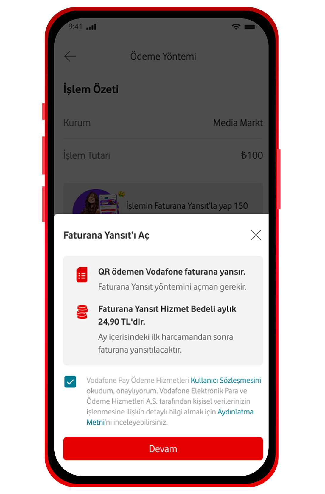 Vodafone Pay uygulamasında TR Kare kod (QR) ile ödemede Faturanı Yansıt’ı hem faturalı hem faturasız Vodafone mobil müşterileri kullanabilir. Bu yönetimi seçmen halinde Faturana Yansıt kapalı ise onayın ile açılır. Ödeme tutarı, işlem ücreti ve Faturana Yansıt hizmet bedeli* işlem onayın sonrası Vodafone Pay uygulamana kayıtlı GSM'e ait en yakın tarihli Vodafone mobil faturasına yansıtılacak ya da faturasız hatlar için TL bakiyesinden düşülecektir. Bu yöntemi kullanabilmek için hattın yasal sahibi olman veya hattın yasal sahibi ile aynı soy isme sahip olman gerekir.