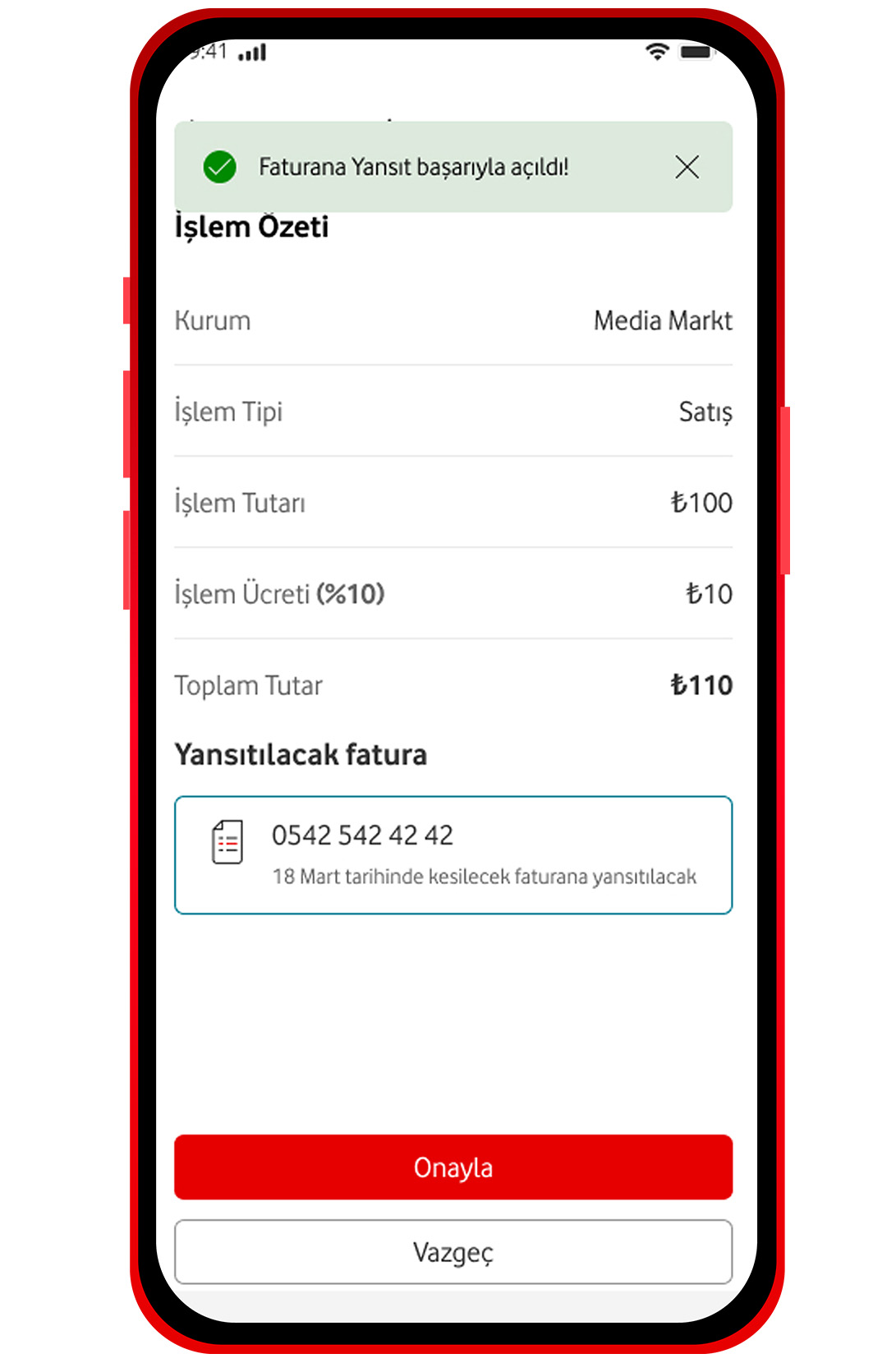 Vodafone Pay uygulamasında Ana sayfada yer alan Faturana Yansıt sekmesine tıklayarak açılan İşlemler ekranında ilgili ödemeni ve ödeme için alınan Faturana Yansıt işlem ücretini görüntüleyebilirsin.